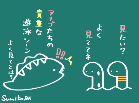 泳いでいる姿が珍しいのは人間界と同じですが、あまりに泳ぐスピードが早すぎてメンバーは目でとらえることができません。